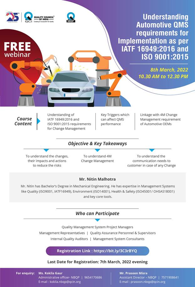 We are pleased to announce a webinar on ” “Understanding Automotive QMS requirements for Implementation as per IATF 16949:2016 and ISO 9001:2015” 8th March 2022 from 10:30am to 12.30pm