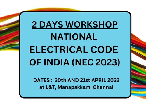Two days workshop on National Electrical Code of India NFE in association with BIS is conducting a 2-Days workshop across multiple locations in India, including Chennai, Mumbai, Bangalore, Hyderabad & Ahmedabad. In Chennai, the workshop is scheduled on 20th & 21st April 2023…